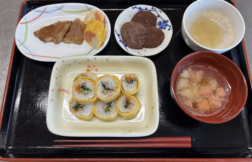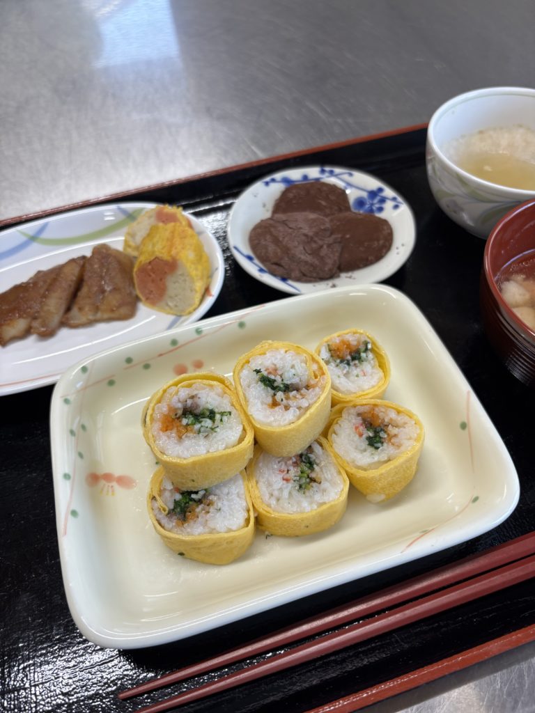 海苔で巻くと噛み切れなかったり、口の中に張り付いたりする可能性があるので卵で巻きます。